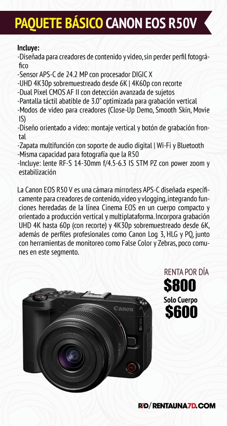 La Canon EOS R50 V es una cámara mirrorless APS-C diseñada específicamente para creadores de contenido, video y vlogging, integrando funciones heredadas de la línea Cinema EOS en un cuerpo compacto y orientado a producción vertical y multiplataforma. Incorpora grabación UHD 4K hasta 60p (con recorte) y 4K30p sobremuestreado desde 6K, además de perfiles profesionales como Canon Log 3, HLG y PQ, junto con herramientas de monitoreo como False Color y Zebras, poco comunes en este segmento.