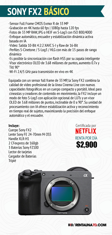 Equipada con un sensor full frame de 33 MP, la Sony FX2 combina la calidad de video profesional de la línea Cinema Line con nuevas capacidades fotográficas en un cuerpo compacto y portátil. Ideal para cineastas y creadores de contenido en movimiento, la FX2 incluye un modo de foto S-Log3 con aplicación opcional de LUTs y un visor OLED de 3.68 millones de puntos, inclinable de 0 a 90°.