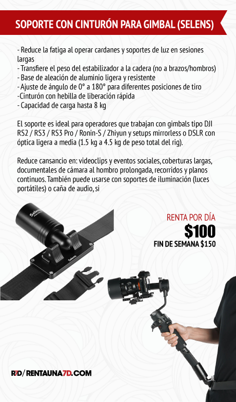 Se puede montar DSLR y Mirrorless. Acepta cámaras altas como la 1DX Mark II y también soporta la Blackmagic Pocket en su versión 4k, 6k y 6k Pro.