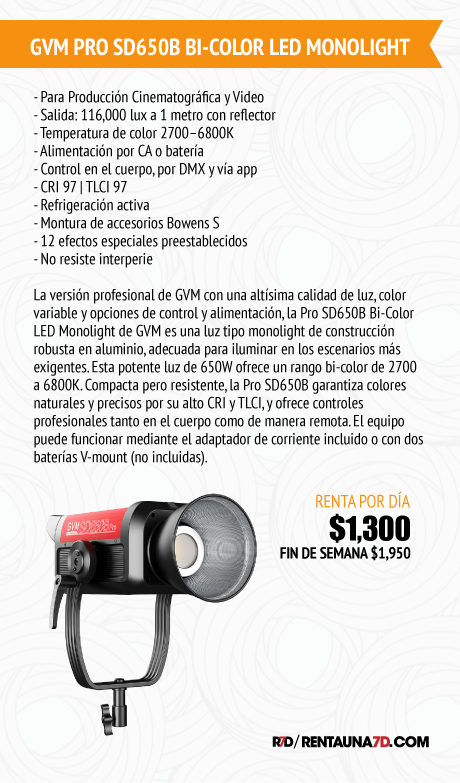 La versión profesional de GVM con una altísima calidad de luz, color variable y opciones de control y alimentación, la Pro SD650B Bi-Color LED Monolight de GVM es una luz tipo monolight de construcción robusta en aluminio, adecuada para iluminar en los escenarios más exigentes. Esta potente luz de 650W ofrece un rango bi-color de 2700 a 6800K. Compacta pero resistente, la Pro SD650B garantiza colores naturales y precisos por su alto CRI y TLCI, y ofrece controles profesionales tanto en el cuerpo como de manera remota. El equipo puede funcionar mediante el adaptador de corriente incluido o con dos baterías V-mount (no incluidas).