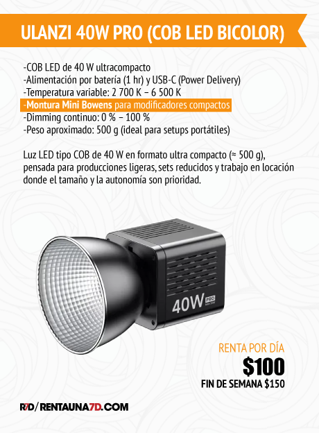 Luz LED tipo COB de 40 W en formato ultra compacto (≈ 500 g), pensada para producciones ligeras, sets reducidos y trabajo en locación donde el tamaño y la autonomía son prioridad.